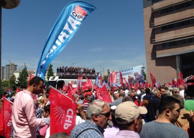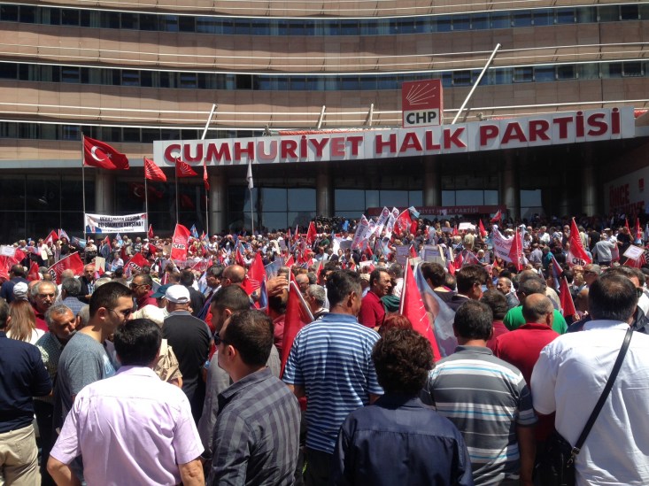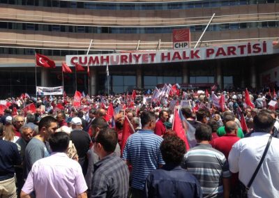 CHP Genel Başkanı Kemal Kılıçdaroğlu’na şehit cenazesinde yapılan mermili protesto ve provokatörlerin saldırısına tepki vermek için İl ve İlçe Başkanları ve yönetim kurulu üyeleri sabah 11.00’’de CHP Genel Merkez Binası önünde toplandı.